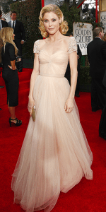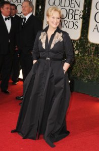 Zoey’s green number reminds me of dance outfit I wore in 1992, for Marky Mark’s “Good Vibrations” – it was wrong then, and it’s wrong now.  Piper P.’s dress is just plain ugly.  The sheer material around her breasts make it look like she has none.  And the color washes her out (more on nude dresses in a minute).  Meryl looks like she’s on the way to a rodeo.  I guess at this point she’s won so many awards she really doesn’t give a damn.