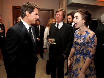 What do you think Lily Collins is more shocked about? The fact that she ran into Tom Cruise at the after party, or the fact that she’s basically nude in front of everyone? I mean, sure, she’s got that blue algae covering up some stuff. But still, kinda embarrassing. (stop making me speak ill of my favorite singer’s offspring; I’m already trying to contend with The Eyebrows.)